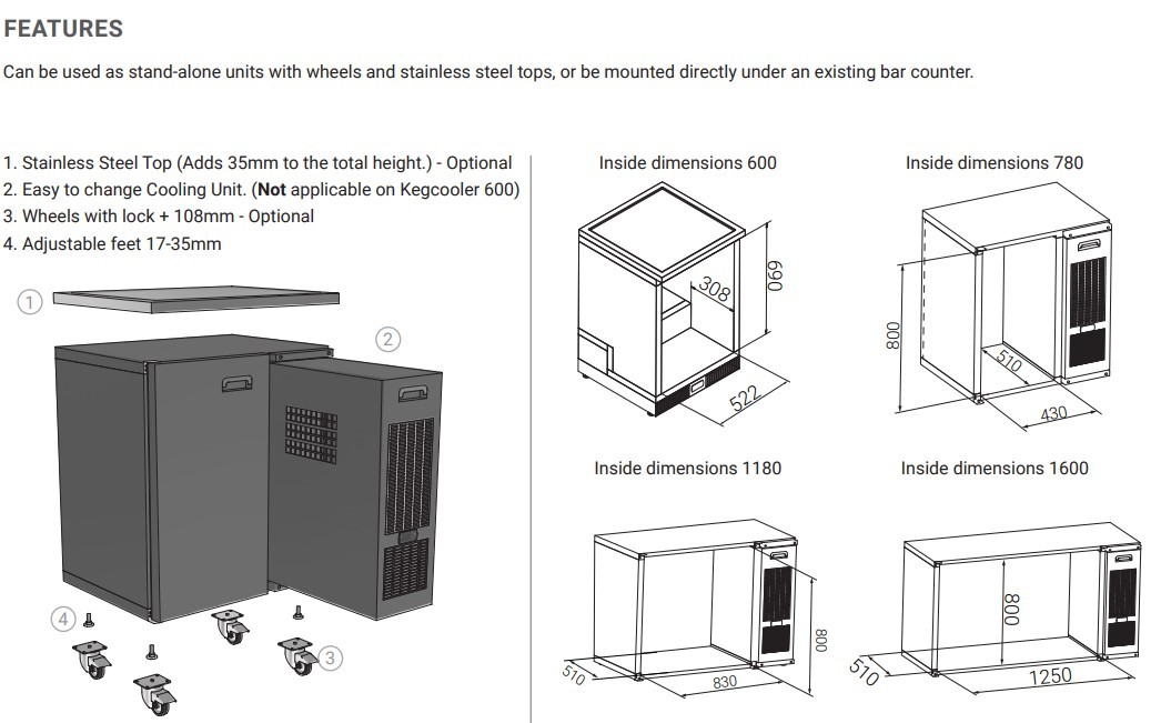 Tapptorn kan monteras direkt på fatkylen med eller utan mellanliggande barskiva. Fatkylen kan som tillval utrustas med en måttanpassad barskiva av rostfritt stål och hjul med eller utan broms. Fatkylens kylenhet kan enkelt kopplas loss vilket underlättar service och periodiskt underhåll. Fatkylens ben kan justeras 17-35 mm