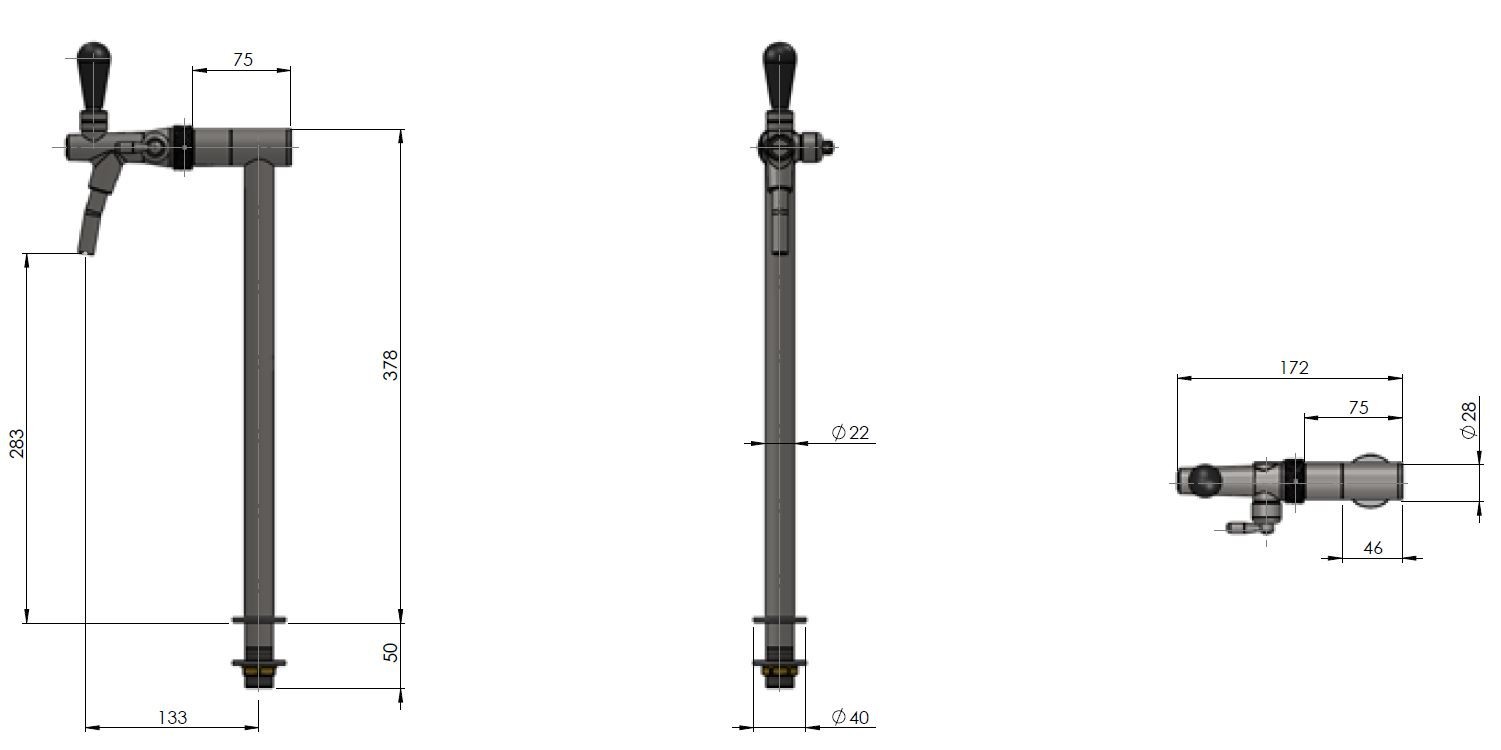Tappkranen levereras komplett med bakstycke, packningar, distanser och muttrar för montering i ett tapptorn eller direkt i ett hål med en diameter på 5/8″. Kranen ansluts till dryckesledning via snabbkoppling eller traditionell anslutning, läs mer under tillbehör.